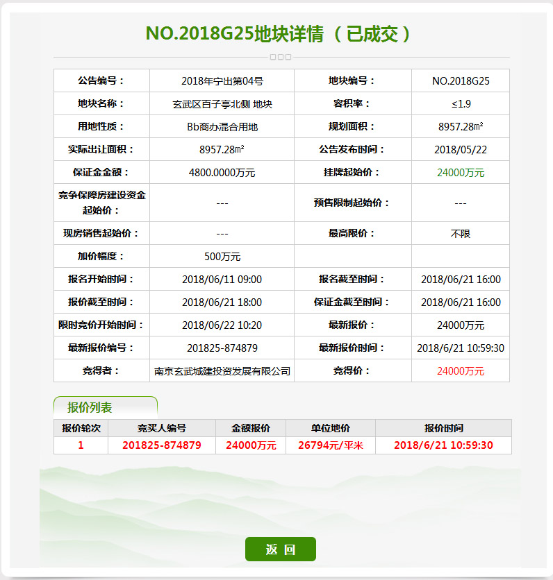 5、城中G25地块,经过1轮竞拍,被南京玄武城建投资发展有限公司以底价2.4亿元竞得。
