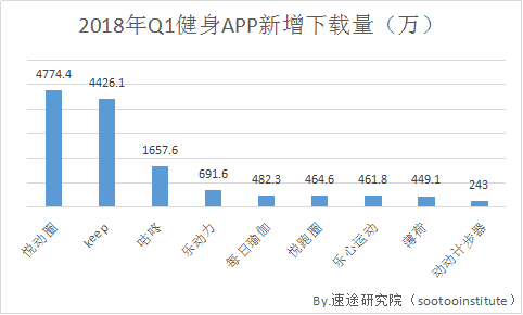 在2018年Q1健身APP新增下载量的统计中,悦动圈和keep以绝对优势排在前两位,均超过四千万次;咕咚新增下载量处在中游,达到1600万次以上,其他平台则都在四百万次左右,相差不多。