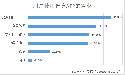 健身是三分练七分吃,有大部分用户希望从健身APP中得到合理的健身食谱,健身APP中推荐的食谱味道和食料搭配相对合理,能够有效协助用户实现健身目标。此外,社交也是一小部分用户强烈需求的,这类用户喜欢在社交圈分享健身照片并通过社交圈记录健身过程,因此目前大部分健身APP都有可供分享的社交圈。