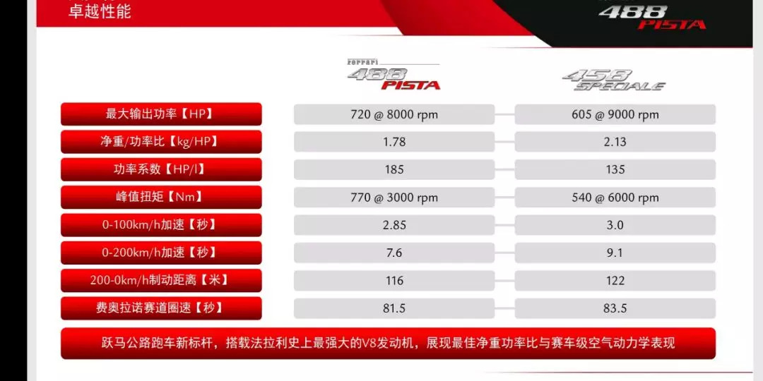 从发动机、车身到一体成形锻造碳纤维轮圈,PISTA整车较488 GTB减轻了约100公斤,乾重只有1280公斤,换算720hp马力等于重量马力比只有1.91kg/hp,你关心的0-100km/h只要2.85秒,0-200km/h只要7.6秒,极速不清楚,保证超过340km/h就是。