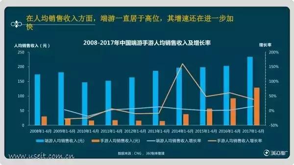 2008-2017年中国端游手游人均销售收入及增长率(CNG 360)