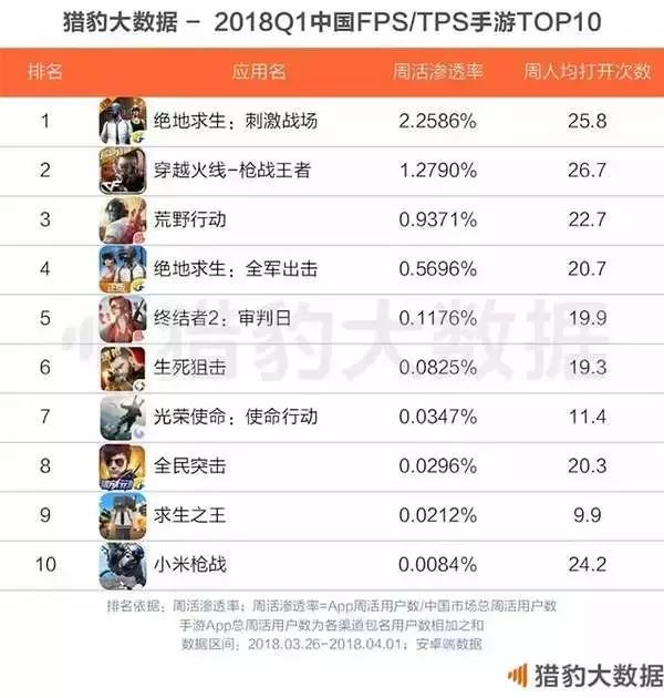 猎豹大数据的最新数据显示,多款吃鸡类FPS游戏在2018年Q1的手游市场中表现亮眼;其中,腾讯的《绝地求生:刺激战场》遥遥领先,拥有约2.26%的周活渗透率。