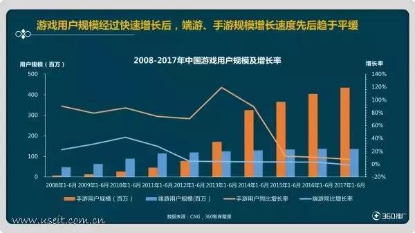 2008-2017年中国游戏用户规模及增长率 (CNG 360)