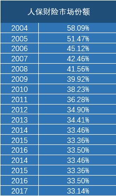 依靠财险并不是问题,问题是寻找可持续增长的后发力。在财险市场竞争更为白热化的状态下,财险板块还能保持多久的头部优势,整体大背景下的人保财险近年来市场份额虽然仍保持头部优势,但份额却是连年下降,从2004年的58.09%一路下滑至2017年的33.14%。