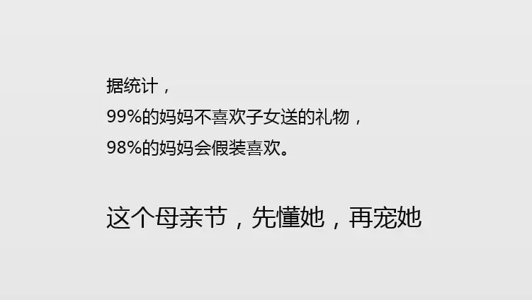 比如在母亲节时,想要说服年轻人给妈妈送一款黑科技智能音箱,文案可以怎么写?提起母亲,大部分人脑海中第一闪过的礼物不外乎是锅碗瓢盆、衣服围巾、扫地机器人等,最不可能想到的就是黑科技数码产品了。所以文案的策略就应该是,首先打破用户这个惯有的认知,用最朴实的文案表达就是“你之前送给妈妈的礼物都送错了”,显然,如果我们把这句文案递交给用户,是100%不会过稿的,这个时候,我们就要利用一些文字技巧,对我们的核心洞察进行包装,“数据”是一个非常实用的方法: