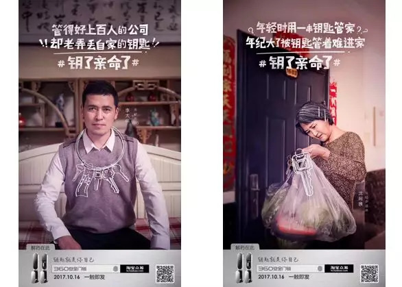 海报通过一组细节鲜明的人设设定(年轻插画师、CEO、退休老人等),让不同年龄、职业的用户群体都能从中找到共鸣,同时利用“金句”文案,让表达变得更有嚼头。比如“管得好上百人的公司,却老弄丢自家的钥匙”,这句文案就使用了“对比法”,一个管理着上百人公司的CEO形象,对比一个“管不好自家的钥匙”忘带钥匙的男子形象,在对比中突出“一把小小的钥匙却比公司还难管理”这一核心冲突,告诉用户,无论你是谁,都难逃因“忘带钥匙”而被门挡在家外的痛苦。而另一句“年轻时用一串钥匙管家,年纪大了被钥匙管着进不了家”也是异曲同工。