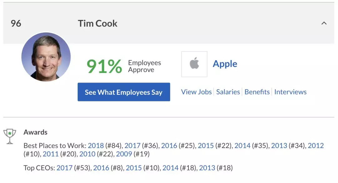 成立于 2007 年的 Glassdoor 是美国的一个公司评级网站,通过身份审核的公司员工或前员工可匿名评价公司及其管理层。在该网站最新出炉的「百强 CEO」评选中,苹果 CEO 蒂姆·库克排名下降至 96 名,去年他排名第 53,前年则位列第 8。