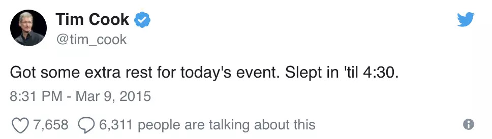 在库克的 Twitter 中,有过那么一次「懒觉」记录:「为了今天的大会多休息一会,一直睡到了 4 点半」。当天是苹果一年一度的开发者大会,这或许是能让库克多睡一会的唯一理由。