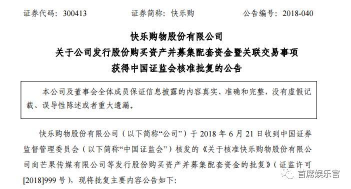 在今年3月份,爱奇艺、B站接连在美国纳斯达克上市后,今年4月,芒果TV也迎来了好消息。4月26日晚间,快乐购发布公告称,其于 2018 年 4 月 26 日收到了中国证券监督管理委员会通知——经审核,快乐购发行股份购买资产并募集配套资金暨关联交易事项获得有条件通过。