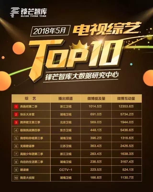 锋芒智库大数据研究中心2018年5月电视综艺TOP10微博提及量、互动量