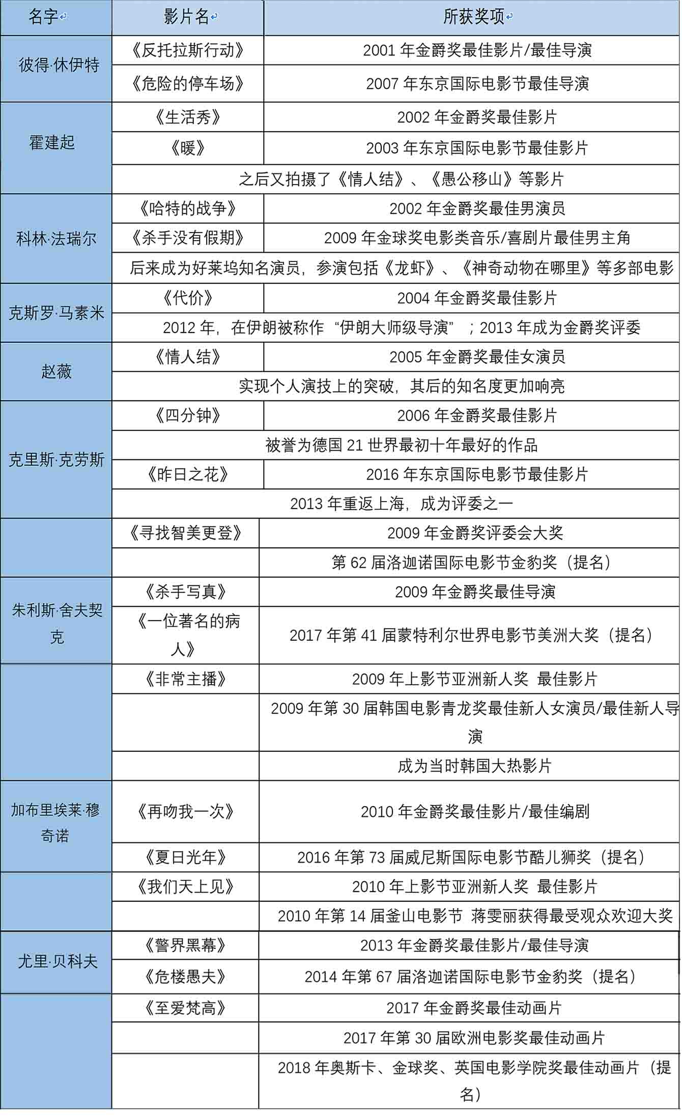 因电影《那山那人那狗》而广为人知的霍建起导演也曾于2002年凭借《生活秀》赢回金爵奖最佳影片奖,之后他的电影《暖》也在东京国际电影节上收获金麒麟奖(最佳影片奖)。值得一提的是,2005年,因主演了霍建起导演的电影《情人结》的赵薇在这部电影里实现了个人演技上的突破,获得当年金爵奖最佳女演员奖,其后她在演艺圈的知名度更加响亮。