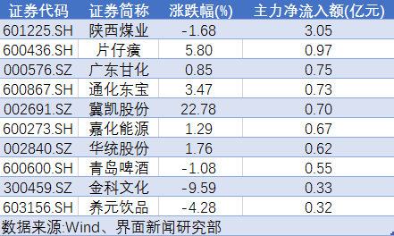 统计数据显示,本周获主力资金持续净流入且四日累计净流入额超过1亿元的个股仅有陕西煤业(601225.SH)一只,紧随其后的片仔癀(600436.SH)、广东甘化(000576.SZ)本周累计净流入额分别为0.97亿元、0.75亿元。