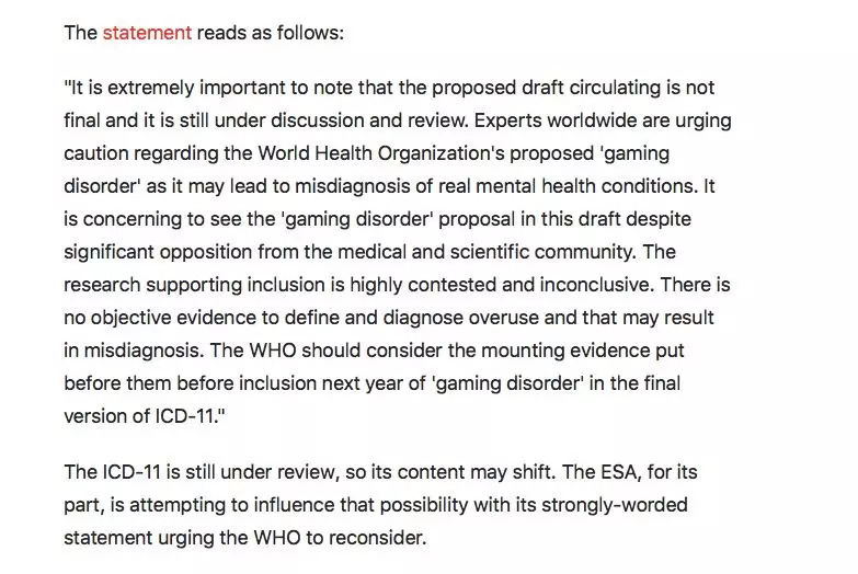 “全球有超过20亿人正安全且明显地享受着横跨各种类型、各种设备以及各种平台的游戏,具有教育、治疗、和娱乐价值的游戏价值也得到了良好地发展和广泛的认同。因此,尽管拥有来自医疗和科学社区强烈的反对,但我们仍然对WHO将’游戏成瘾’列入ICO-11表示担忧,将其列在其中所用的证据也仍然极具争议和不确定性。”