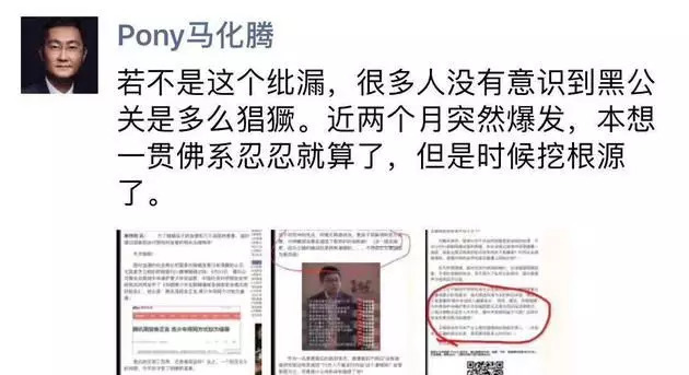6月20日马化腾朋友圈发文向黑公关开炮,近日网上流传一篇题目为《教育专家诤言无昧:腾讯、共青团为何一再为网游洗白》的文章截图,其中一张图片特别标注了一段括号里的话——“这一段去掉吧,因为王铮的确说的是很有道理的。不然会让文章变成为黑而黑。”