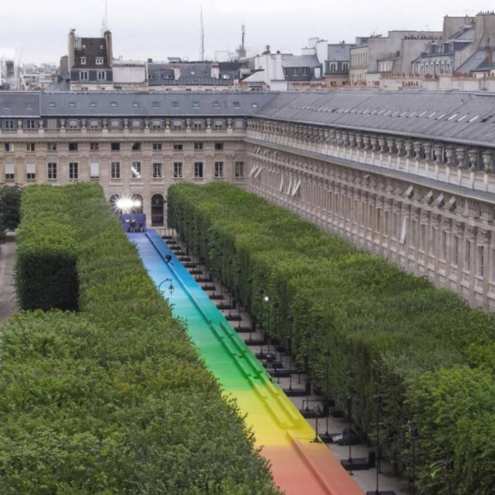 巴黎时间6月21日下午,Virgil Abloh交出了出任Louis Vuitton品牌男装艺术总监后的第一份作品——Louis Vuitton巴黎男装周2019春夏系列。整个秀大玩色彩游戏,从秀场布置、设计主题和现场分发的小礼物都围绕“彩虹色”进行。在巴黎皇家宫殿,200米长的彩虹色T台在大片绿植与古典建筑的包围中异常显眼。