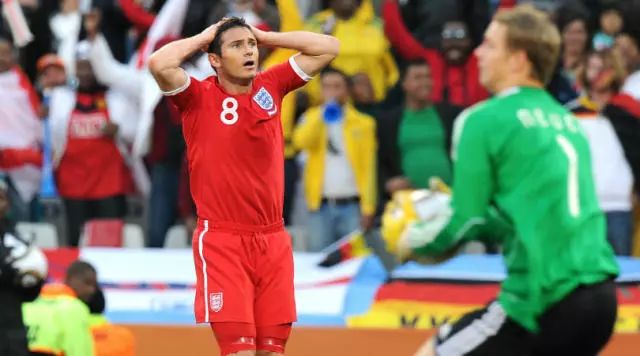 2010年,英德在16进8的淘汰赛里相遇,续写前缘。在0:1落后的情况下,英格兰的兰帕德在禁区弧内挑射,球打中横梁弹地而出,虽然皮球最终被德国门将没收,但回放显示皮球越过了门线。也就说,进球有效,但裁判吹掉了这粒好球。受判罚影响,英格兰队一泻千里,以1:4惨败。