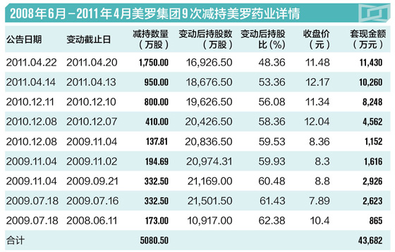 2008年6月至本次重组方案公布之前,美罗集团大规模减持共计9次,减持数量总计为5080.50万股,占美罗药业总股本的14.52%,持股数量降至1.69亿股,持股比例降至48.36%,累计套现4.37亿元,这接近于美罗药业2004年改制时收购方成本的10倍。