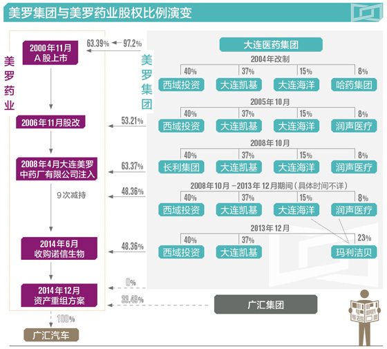 2008年4月,美罗药业通过非公开发行方式,将美罗集团持有96.4%股权的大连美罗中药厂有限公司注入上市公司,资产注入后,美罗集团对美罗药业的持股比例提升至63.37%。