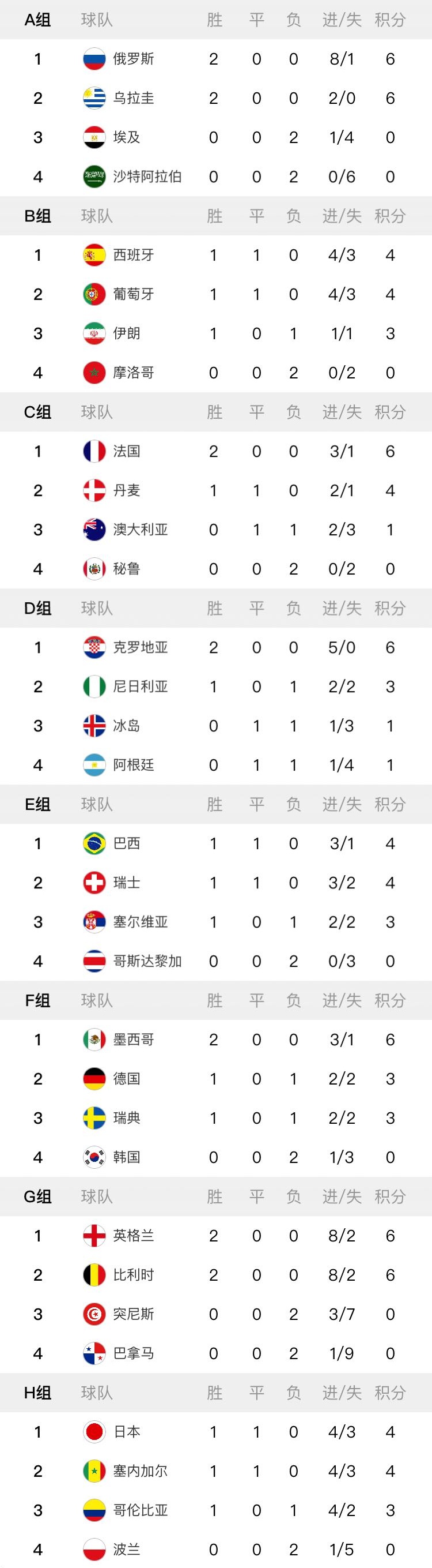 北京时间6月25日凌晨,2018年世界杯小组赛第二轮已经全部战罢,各小组的出线形势至此初露端倪。目前,两战全胜的俄罗斯、乌拉圭、法国、克罗地亚、比利时、英格兰已经提前晋级16强,而埃及、沙特、摩洛哥、秘鲁、哥斯达黎加、巴拿马、突尼斯、波兰则无奈出局。此外,包括德国、阿根廷在内的其他18支球队,将在最后一轮为剩余10个出线名额而战。
