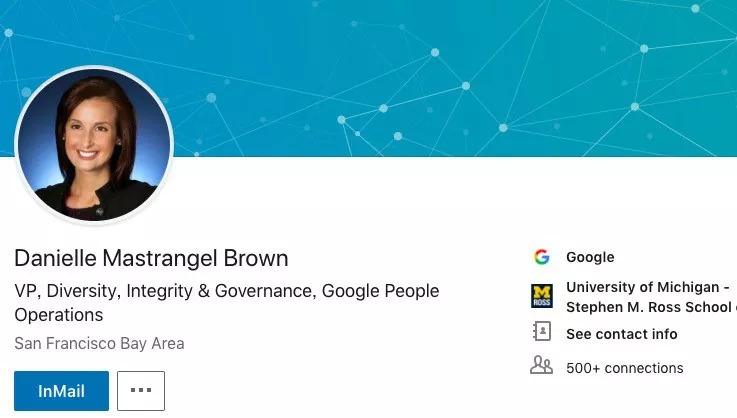 这位传说中的女友名叫 Danielle Brown,曾经是英特尔的首席多元与包容官(Chief diversity and inclusion officer)兼人力资源副总裁。已经于 2017年6月加入谷歌,也是担任首席多元与包容官,负责谷歌全球事务的公平、多样和包容的战略及努力,以及人员运营的合规性、完整性和治理功能。