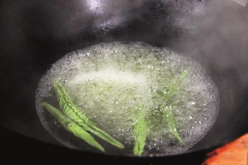 3、入沸水中焯烫,去除涩味。