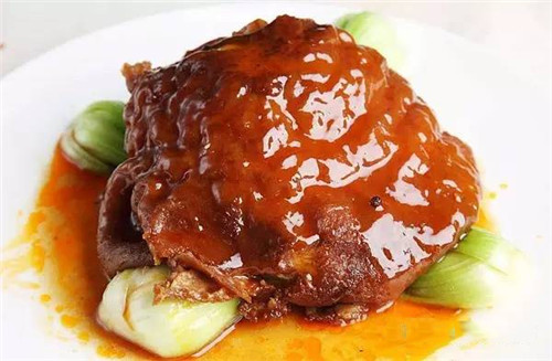 此菜在传统煨肘子的基础上有所改进,煨好的肘子不仅要用荷叶包起来蒸制,而且还要浇咸鲜味汁上桌。因此,这肘子能吃到一股荷叶的清香味。