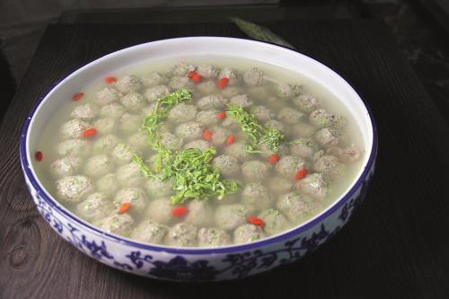 3、锅内倒入清汤烧开,用盐、味精调味,下入丸子烧开,淋入芝麻油,撒入荷叶尖丝和枸杞即可上菜。