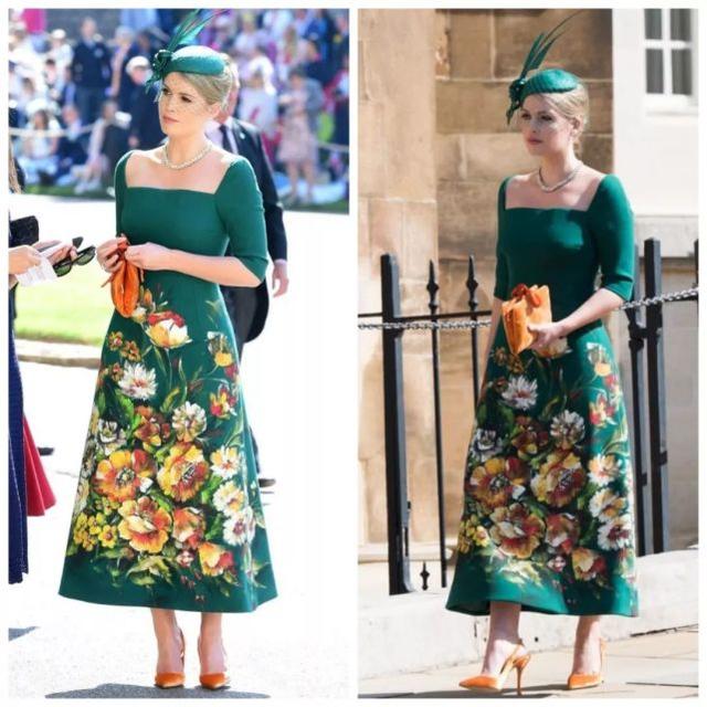 之前哈里王子大婚,戴安娜王妃的侄女Kitty Spencer就穿了一条Dolce&Gabbana绿色大方领晨礼服,搭配同色系帽子、和印花呼应的鞋子与手包,美得像中世纪走出来的贵族少女。