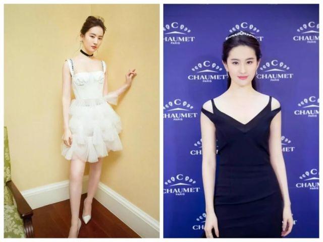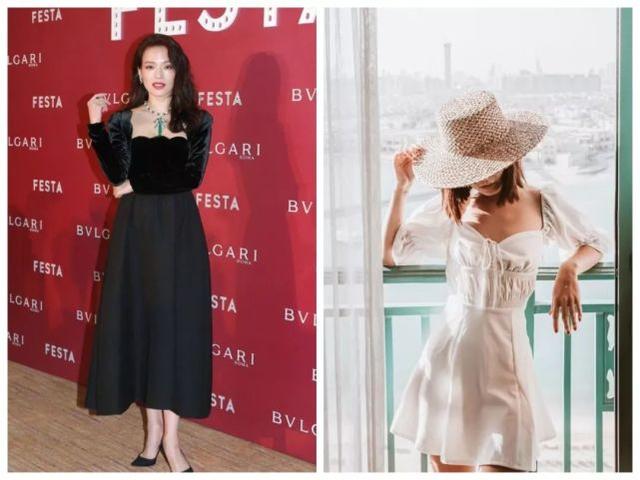除了小飞袖之外,溜肩姑娘还可以穿偏宽而且外开的肩带,最好还能在肩膀那里垫高一点,这样就显得肩膀没那么削。刘亦菲穿上左边这件心机满满的方领吊带裙之后,肩膀看上去平了不只一点点!