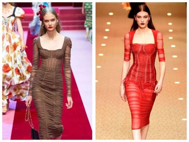 宽肩的姑娘尽量选上宽下窄的梯形领口,上边越宽修饰的效果越好。窄肩的姑娘反过来更适合上窄下宽的梯形领口。看看DG秀场上的同一个模特, 是不是右边的肩膀看上去宽多了?