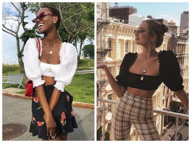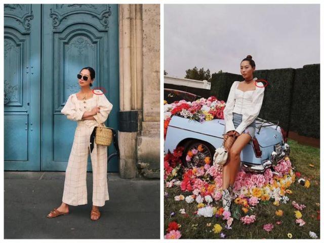 比如像Aimee Song穿的这两件,乍一看左边泡泡袖比右边更大,但实际却是右图看上去更壮。原因就在于左边的肩头部位其实是垂下来,而非蓬上去的。