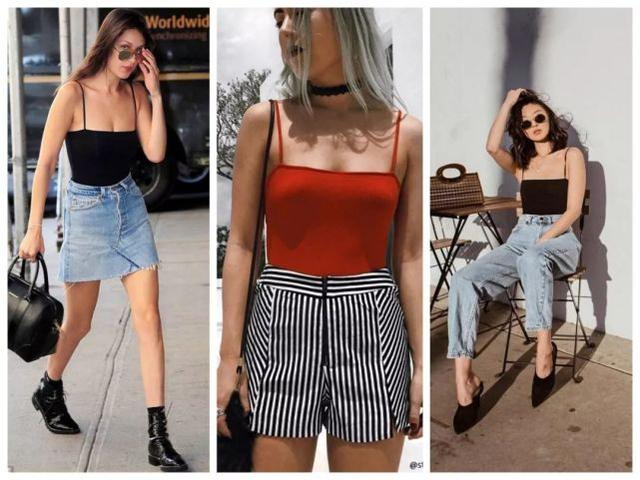无袖方领上衣主要是吊带,其中最火的是长度在腰以上的短上衣,很多身材超级好的小腰精都喜欢穿方领crop top炫腹,但小8建议如果有姑娘想这么秀的话下半身一定要选比较中性的裤型,这样才能中和过分的性感。