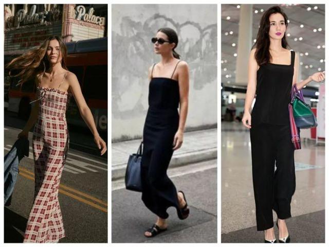 今年夏天也很流行方领吊带连体裤,而且裤腿要阔,走路带风的感觉比连衣裙更潇洒。不过还是要注意收腰。嫌连体裤穿脱麻烦的姑娘也可以用同色系的裤子伪装,卢靖姗就是,看得出是两件吗?