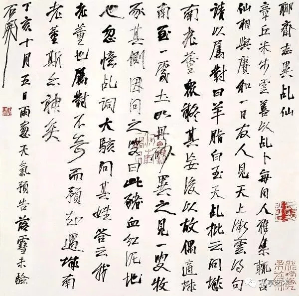 在突破审丑和审美两极境遇的困顿上面,有明一代书法给我们很深的启迪。明代前期、中期、晚明书法都取得很大的成就,比如前面提到的明初宋克、宋广等等,到中期吴门书派、云间书派到晚明四家书法再至清初王铎、傅山、朱耷等人的书法直至今天仍然夺人眼目!明代属于中国古典社会后期,书法家们面临魏晋钟王、唐代大楷、狂草、宋代尚意书法、元代赵孟頫复古书风等等几座难以逾越的高峰。前人在笔法、结构和章法形式都取得近乎极致的成就,但明代书法家为何尚能在这些成就之外,不畏艰难,另辟蹊径,创造出中国书法的又一个高峰?另外,明代后期商业经济,市民社会,个性解放等等文化背景与今天现代性社会有不少相似之处,其书法形式相比魏晋唐宋书法更贴近当代人的心灵。我们看张瑞图、傅山、王铎等人的书风,更能体会个性自由、视觉感官的丰富性。从某种意义说,明清行草书法何尝没有「现代」意识;张瑞图、傅山、黄道周、王铎等人的书法也绝非当代丑书;完全抛离传统,也非一味复古,而是吸取篆隶、魏晋、唐宋元代书法加以综合、融通创造的结果。比如,张瑞图书法属于大写意范畴,滔滔不绝的气势,率直自然的挥洒,不拘常规的用笔,既反映了那个时代动荡不安的躁动心态,也表现其内心的激越情怀,其书法何尝不具有现代人的某种情愫?若从审美和审丑的两极境遇来看,张瑞图书法受过时代人批评,清代梁巘说他:「张瑞图用力劲健,然一意横撑,少含静穆之意,其品不贵。」按照传统士人观点,张瑞图书法也有「丑」的不足,但其「丑而不丑」才是其书法创造性真谛所在。我们在晚明傅山、王铎、朱耷等伟大书法家那里均可以分析出这些书法家「假丑」而「真美」的奥妙。比晚明书法家更「丑」的张弼、徐渭、詹景凤等书法家,也完全不能与今天丑书相提并论,个中奥妙,值得玩味。晚明行草的高峰是站在前面几座高峰再加以融合、贯通、创造的结果,明代书法审美和审丑都没有走入极端。纵观明代书法的贯通融合,足以启示当代书坛走出困境。