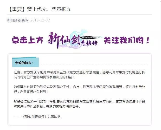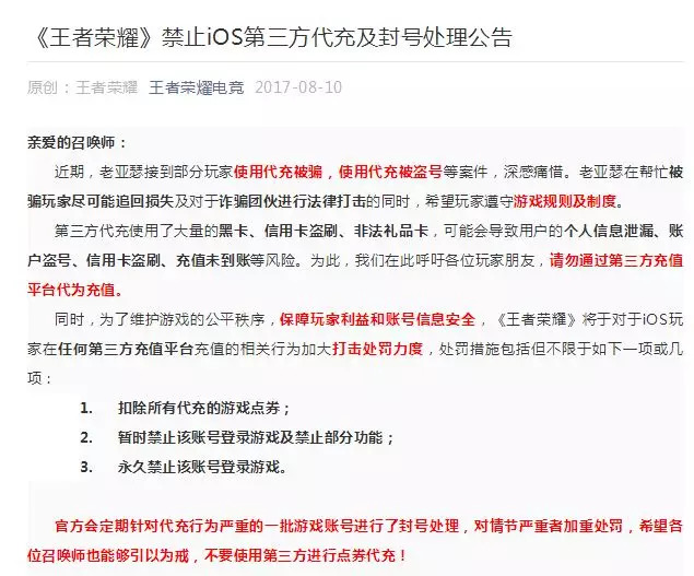 既不能放弃苹果这一“金大腿”,又必须接受这一“金大腿”的不作为,游戏厂商的处境不可谓不尴尬。游戏厂商们只能自己想办法,尽量减少因游戏代充造成的损失。事实上,有越来越多的厂商已经发布了公告,严厉打击iOS代充行为。