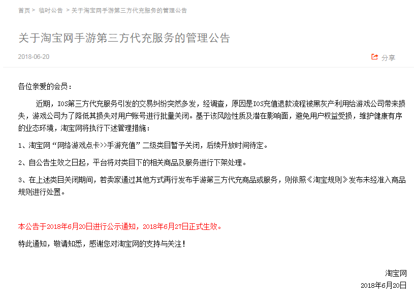 近日,淘宝网发布公告,由于iOS充值退款流程被恶意利用致使游戏公司蒙受损失,游戏公司不得不对用户账号进行批量关闭,导致近期iOS第三方代充服务引发的交易纠纷突然多发,将于2018年6月27日起将下架所有手游代充服务,后续开放时间待定。
