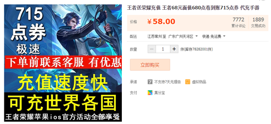 苹果手游代充,一直都是游戏厂商心头痛。在淘宝网随便一搜,就能搜到许多专为App Store中的手机游戏充值的店铺。这种店铺之所以能够吸引客户,就是因为两个字:便宜!例如,人民币与王者荣耀点券的兑换比例固定为1:10,即68元人民币只能购买680点券,而代充店铺则可以做到58元购买715点券,省了13.5元,对于广大并不富裕的玩家而言,这无疑是极具吸引力了。