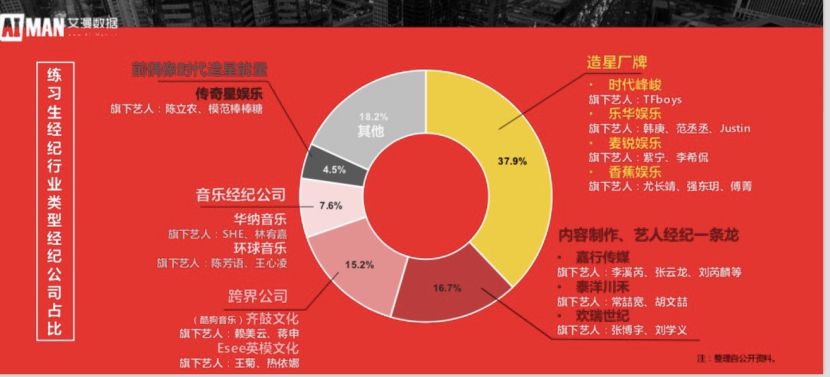 艾漫数据显示,目前偶像市场上的练习生基本来自几家固定的经纪公司。37%的练习生来自时代峰峻、乐华娱乐、麦锐娱乐、香蕉娱乐四大经纪厂牌,进行艺人经纪运营的影视娱乐公司如嘉行传媒、欢瑞世纪等也占有一定练习生资源,市占率为16.7%,传统的音乐娱乐公司如华纳音乐、环球音乐等也提供部分练习生,占比约为7.6%,剩下的市场则来自音乐平台,如赖美云所在的齐鼓文化,模特公司,如王菊所在的Esee英模文化,还有一部分个人练习生。