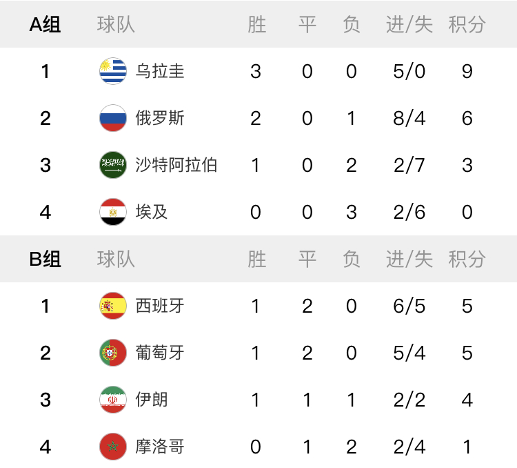 随着A组和B组的尘埃落定,1/8决赛对阵也随之出炉。A组第一的乌拉圭将对阵B组第二名葡萄牙,B组第一的西班牙将遭遇排名A组第二的东道主俄罗斯。