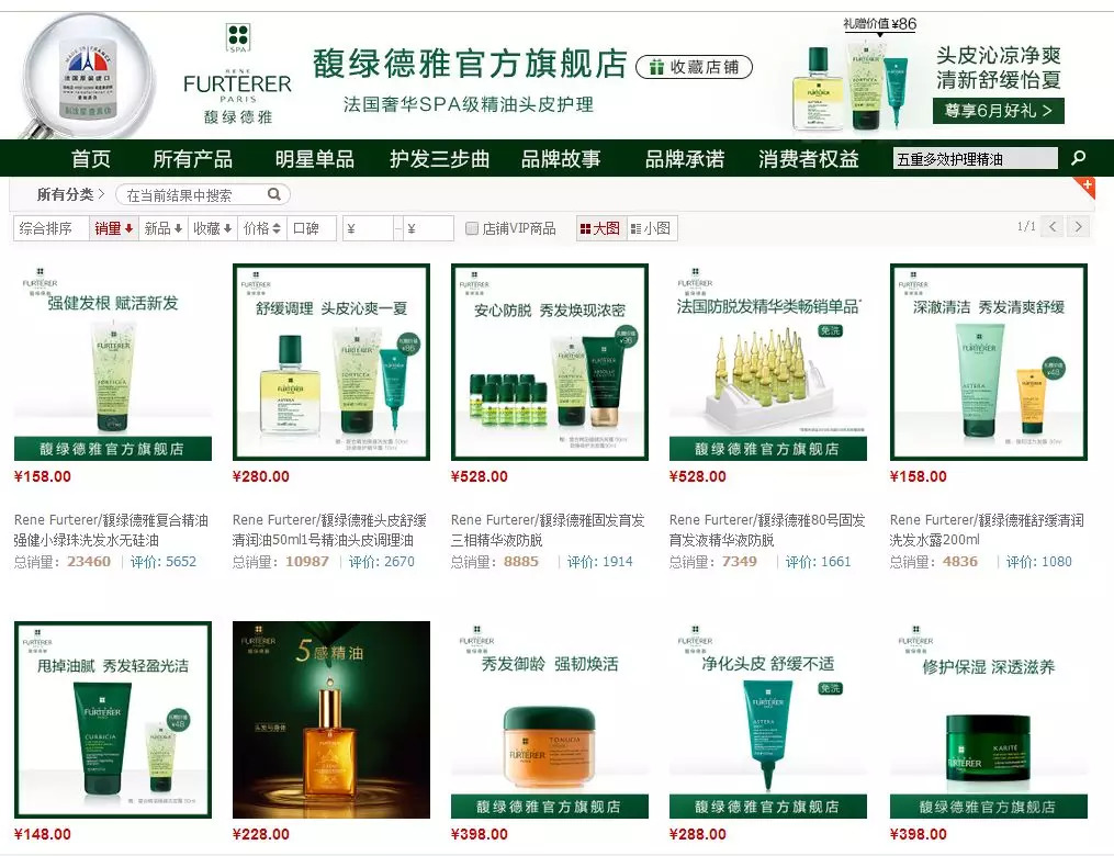 在天猫平台上,虽然馥绿德雅目前整体销售情况并不惊艳,但部分单品已然释放出了能量。比如,在其天猫旗舰店中,售价158元的200ml装复合精油强健小绿珠洗发露总销量为2.3万笔,其中,近一个月的成交量为4982笔;200ml装舒缓清润洗发水总销量4836笔,月成交1404笔。除此之外,其他大多数产品的月销量几乎占据总销量的20%以上。