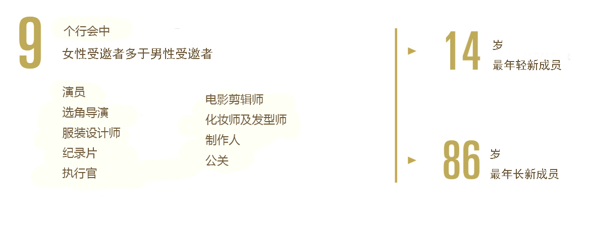 演员是成员中占比例最大的群体,其比例为20%。今年新增成员来自59个不同的国家,比如韩国(演员裴斗娜)、阿尔及利亚(演员索菲亚·波多拉,Sofia Boutella)和印度(演员阿里·扎勒,Ali Fazal)。