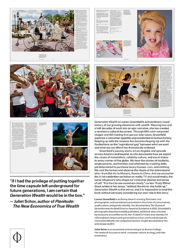 这是一个用25年时间完成的项目,它拍摄了世界各地的人对财富和名气的迷恋与追求,“试图探索人类历史上前所未有的消费欲望”。Lauren的旅程开始于洛杉矶随后遍布美国乃至全球。她用照片和访谈记录了全球富人的奢华生活。同名书籍已由著名艺术类出版商Phaidon出版。同名纪录片将于7月20日在美国上映。
