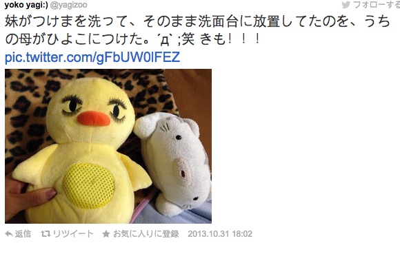 “妹妹把假睫毛取下来,放在洗脸台上,结果老妈就给小鸡戴上了。”