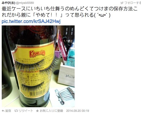 “最近觉得把假睫毛一个个放回盒子里太麻烦,干脆贴酒瓶子上,被老爸老妈给吼了……”