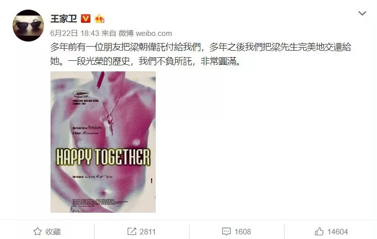 6月22日,王家卫发了一条微博,以很王家卫的方式宣布了梁朝伟与泽东电影公司合约期满。