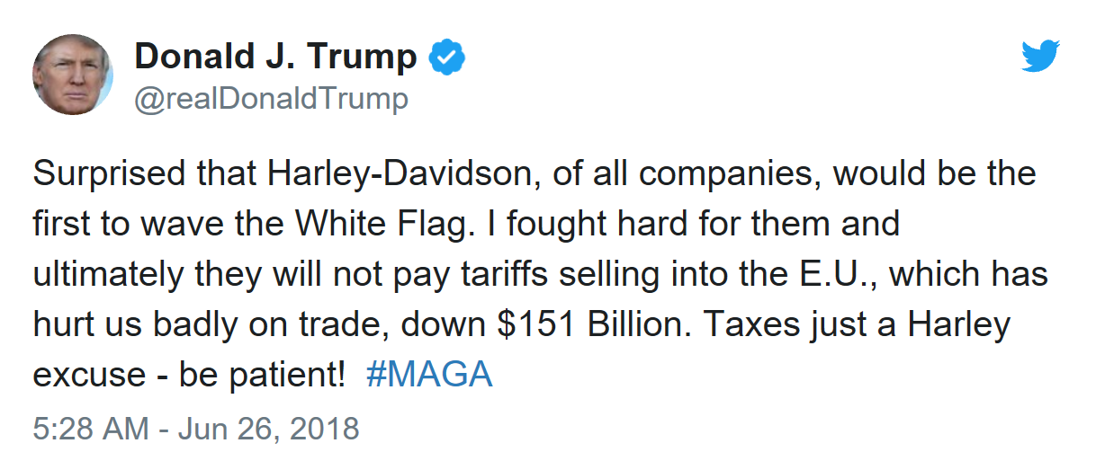显然,此举激怒了曾对其寄予厚望的特朗普。他立刻在推特上回应称:“惊讶地发现哈雷戴维森成为所有公司中第一个举起白旗的。我为了他们拼得很辛苦,最终他们在欧盟销售时将无需付关税。欧盟在贸易上对我们伤害很大,(对美国贸易顺差)有1510亿美元呢。税收只是哈雷的一个借口——有点耐心吧!#让美国再次伟大”。