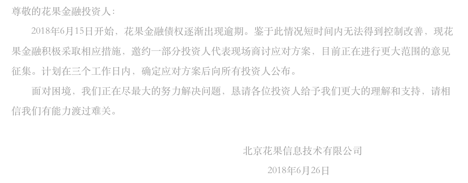 6月26日,花果金融发布公告称,自6月15日起,债权逐渐出现预期,且情况在短时间内无法得到控制改善。