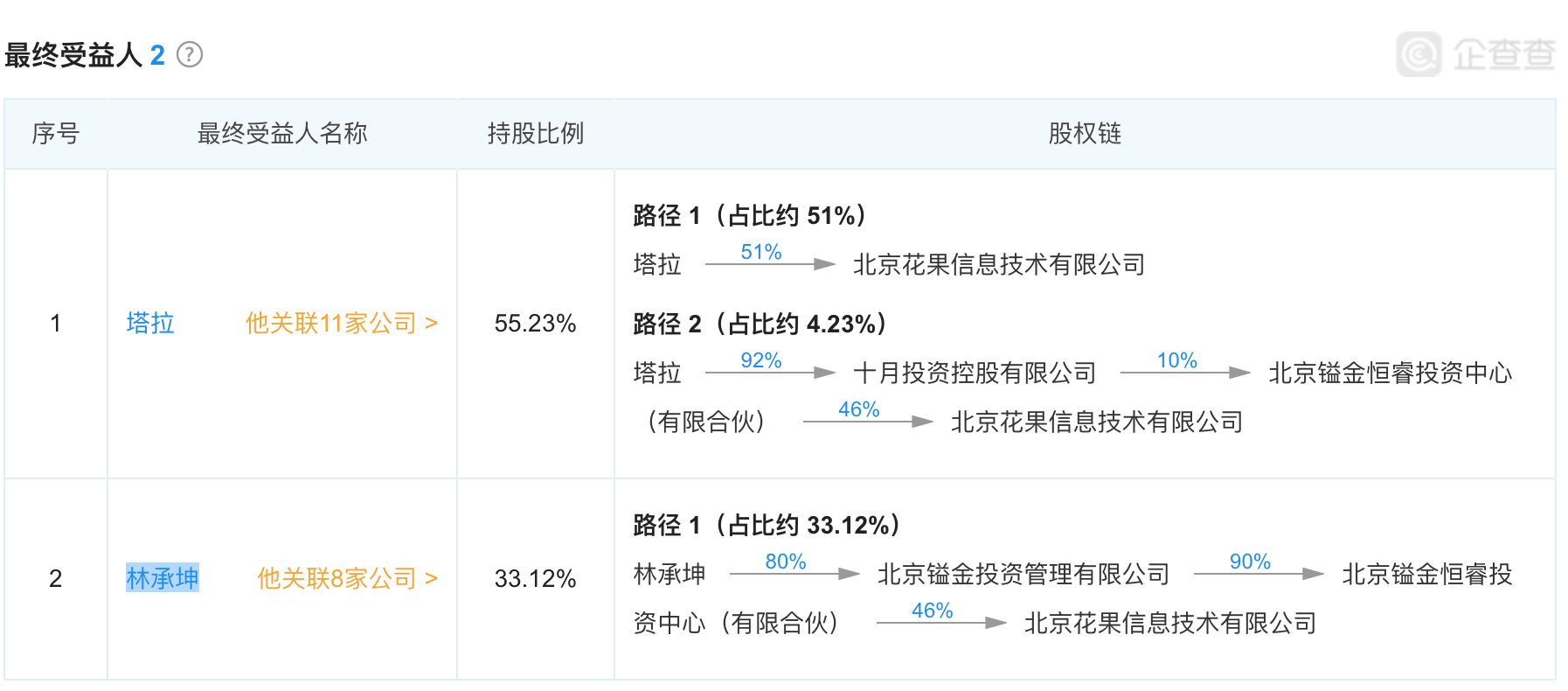 花果金融隶属于北京花果信息技术有限公司,于2013年10月注册,注册资本5000万,实缴资本100万,法人为塔拉,塔拉同时也是控股股东。企查查分析显示,该企业的最终受益人为塔拉及林承坤。