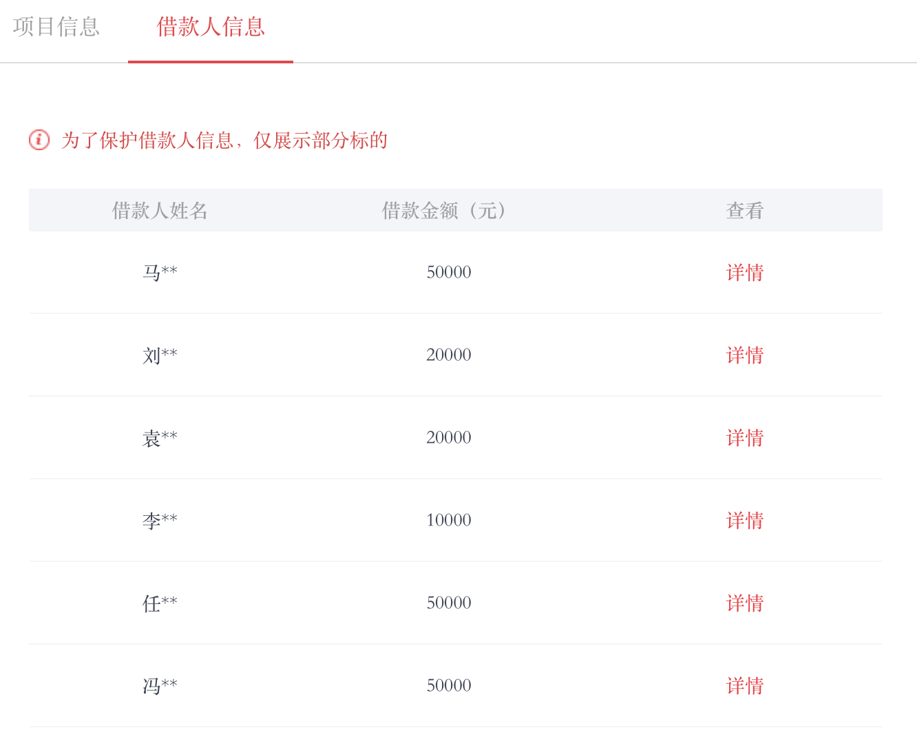 官网显示,花果金融旗下的农友宝借款人为多个个人,详情中仅显示不完整的身份证号码,披露不透明,且可能涉及期限错配。