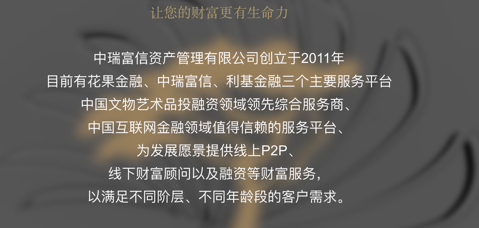 塔拉还在中瑞富信资产管理有限公司(下称“中瑞富信”)担任法人。中瑞富信官网显示,花果金融、中瑞富信以及利基金融是旗下三个主要服务平台,提供线上P2P及线下融资等服务,还涉及中国文物艺术品投融资领域。